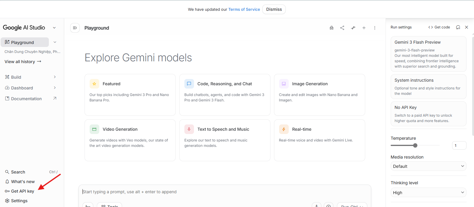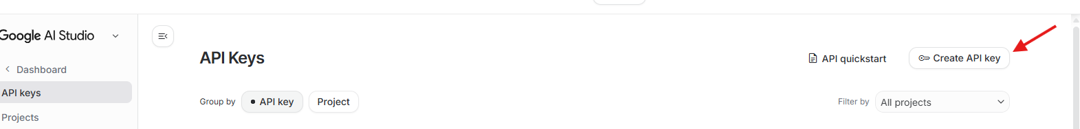 - Nhấn vào nút "Get API Key" hoặc "Create API Key"