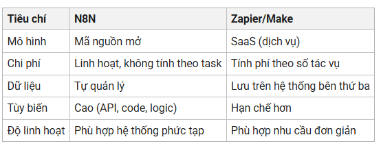 Có thể thấy, N8N phù hợp hơn với doanh nghiệp cần kiểm soát và tùy biến hệ thống, trong khi các công cụ khác thiên về sự tiện lợi cho người dùng cá nhân.