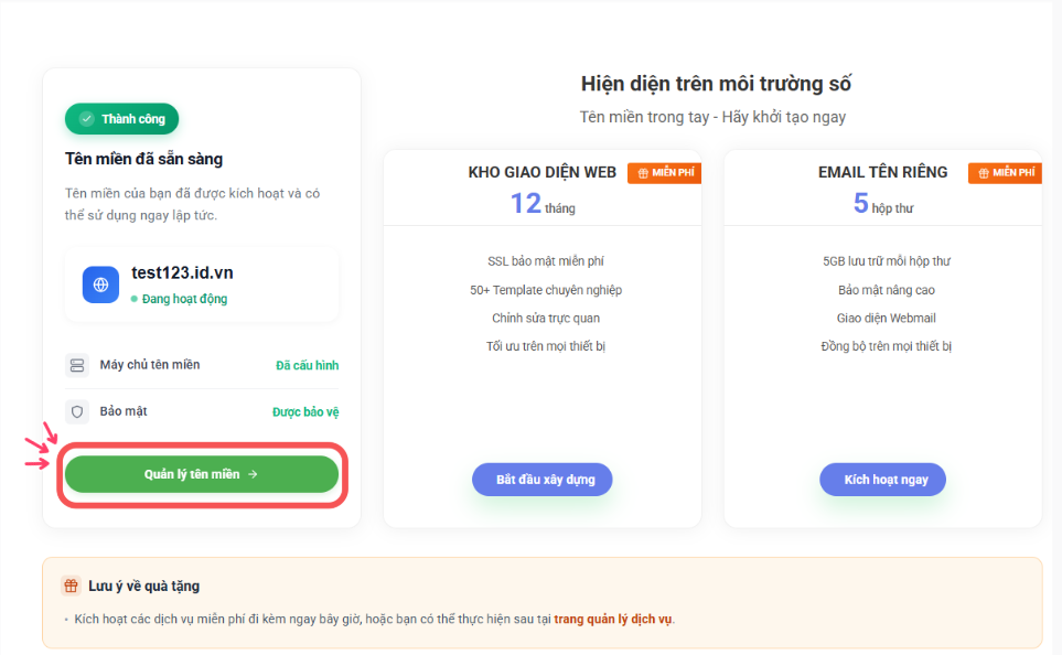 - Để quản lý, chỉ cần nhấn “Quản lý tên miền”: tại đây bạn có thể trỏ DNS, gia hạn, cập nhật thông tin hoặc kích hoạt dịch vụ đi kèm một cách nhanh chóng, tiện lợi.