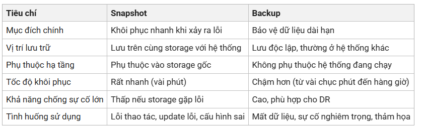 - Không nên sử dụng Snapshot thay thế hoàn toàn cho backup. Snapshot chỉ là giải pháp khôi phục nhanh trong ngắn hạn.