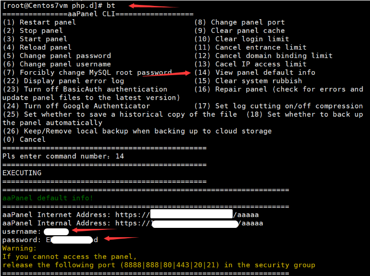 Bước 6: Đối với trường hợp chúng ta quên tài khoản hoặc mật khẩu chúng ta có thể hực hiện lệnh sau trên máy chủ để xem tài khoản bảng điều khiển mặc định