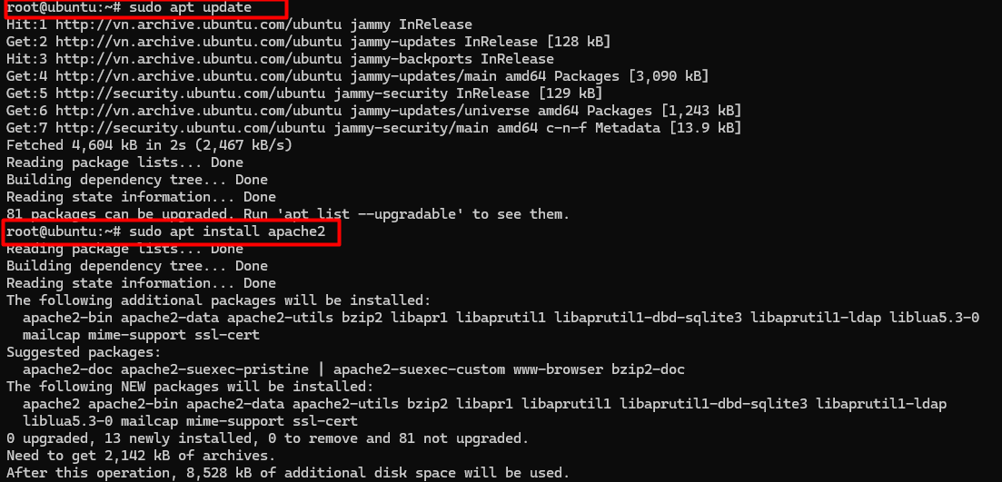 Để cài đặt Apache trên Ubuntu 22.04, bạn sử dụng lệnh sau trong Terminal: