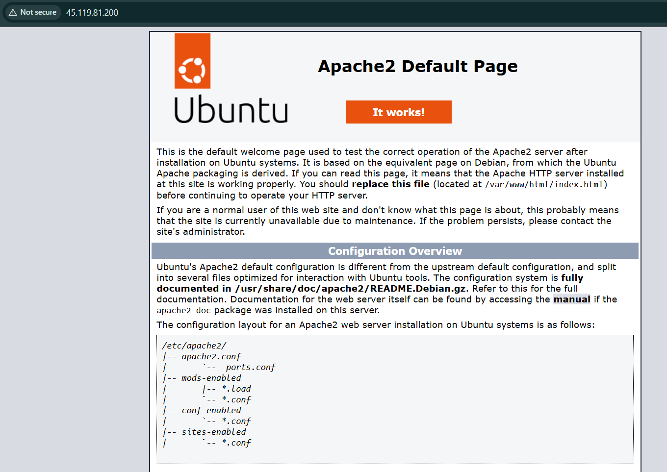 Sau khi cài đặt xong, bạn có thể kiểm tra trạng thái của Apache bằng cách mở trình duyệt và truy cập vào địa chỉ IP của máy chủ. ở đây IP máy chủ của LV là: 45.119.81.200