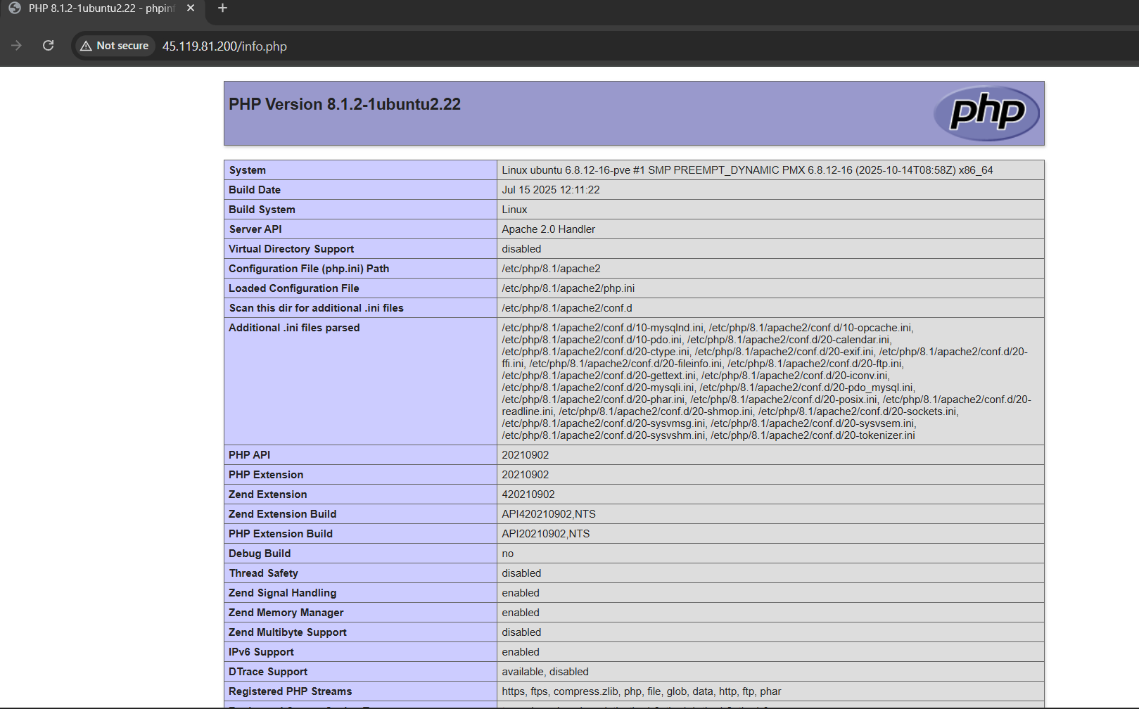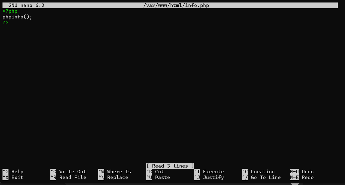 Để kiểm tra xem cài đặt LAMP đã thành công hay chưa, bạn tạo một file info.php trong thư mục /var/www/html với nội dung sau: