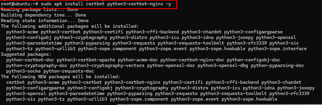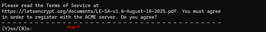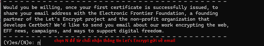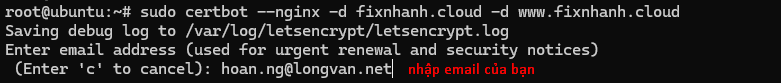 Sau khi cài đặt Cerbot thành công, bạn có thể bắt đầu cài đặt SSL Let’s Encrypt cho domain của bạn. Bạn có thể sử dụng lệnh sau để cài đặt SSL cho domain cụ thể: