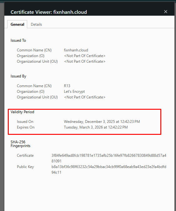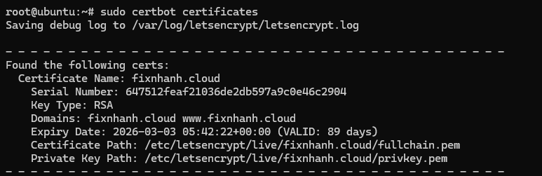 Sau khi cài đặt SSL thành công, bạn có thể kiểm tra chứng chỉ SSL Let’s Encrypt bằng lệnh sau: