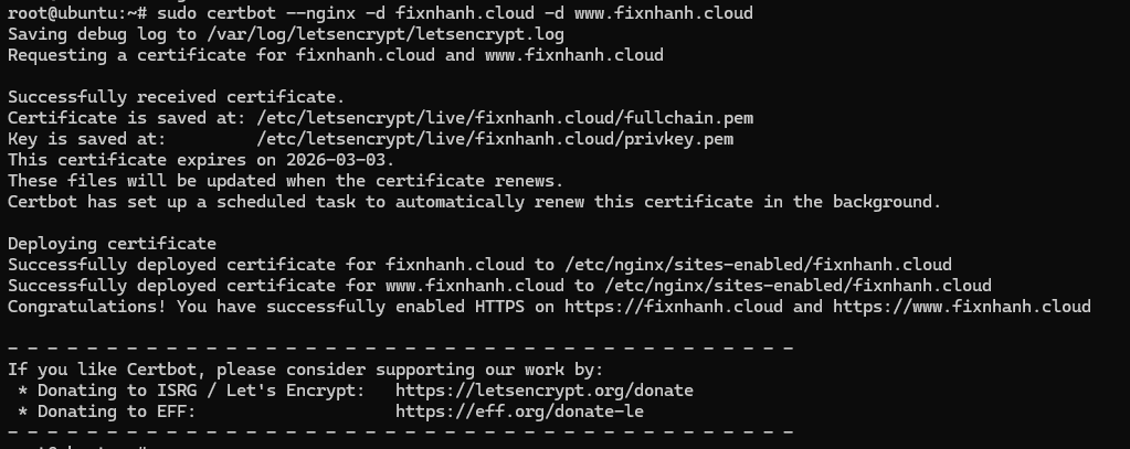Trong đó, example.com thay thế bằng tên miền thực tế của bạn. Cerbot sẽ tự động cài đặt SSL cho domain đó và cấu hình Nginx để sử dụng SSL.