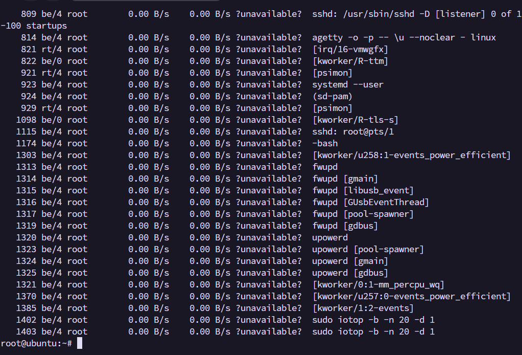 Khi bạn khởi động iotop trên terminal, bạn sẽ thấy một bảng thống kê các tiến trình theo thứ tự sử dụng nhiều I/O nhất. Các cột thông tin bao gồm tên tiến trình, id của tiến trình, tỷ lệ sử dụng I/O đọc và ghi đĩa, v.v.