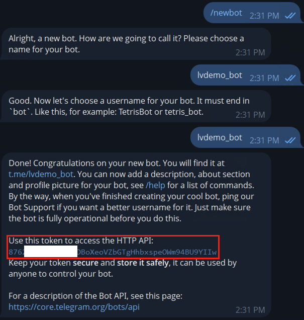 Ở đây sử dụng, telegram (BotFather) để thiết lập để tạo bạn tham khảo lệnh sau: