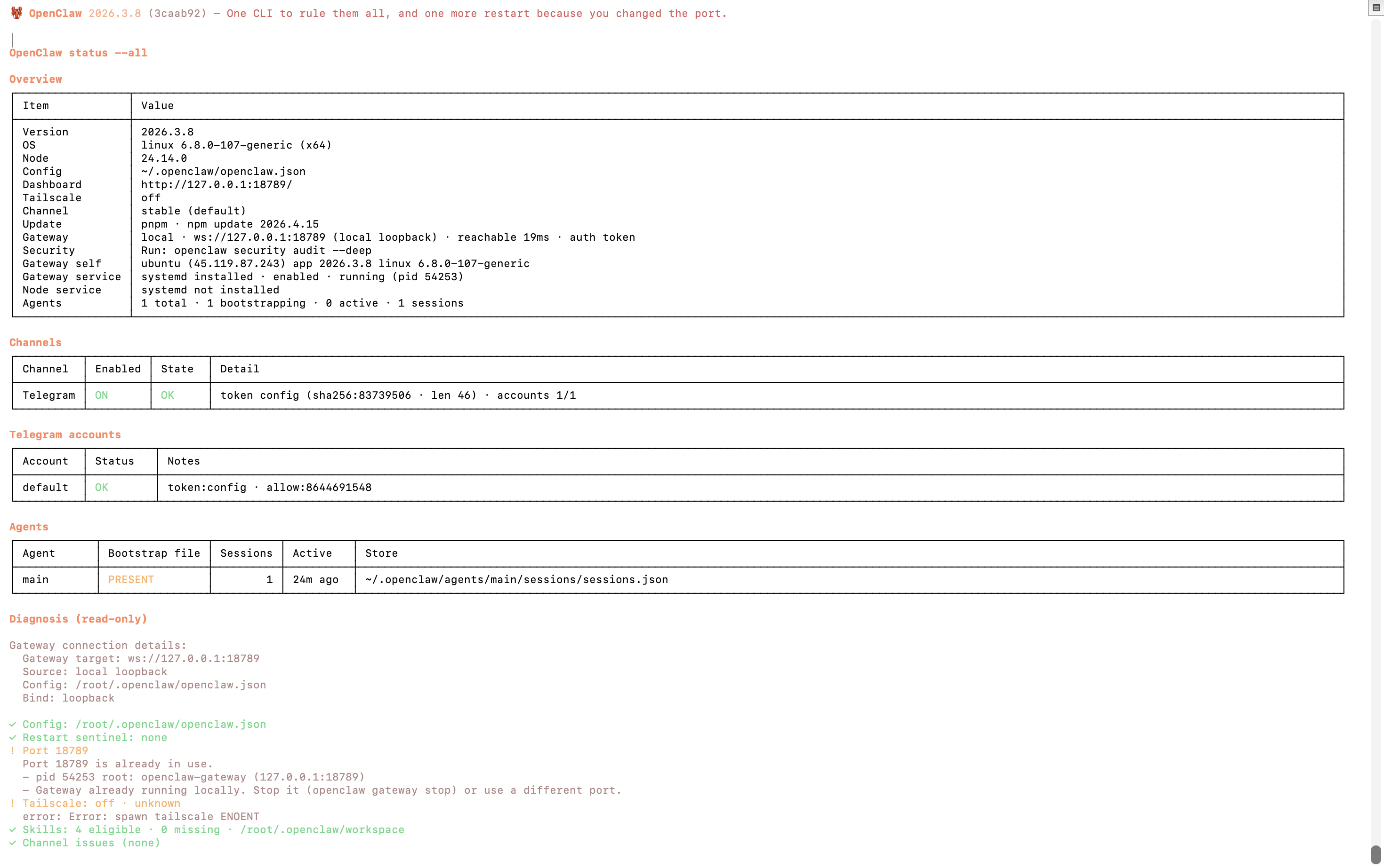 Sau khi kết nối thiết lập thành công, kiểm tra lại trạng thái của OpenClaw trên cli, chạy lệnh: openclaw status --all
