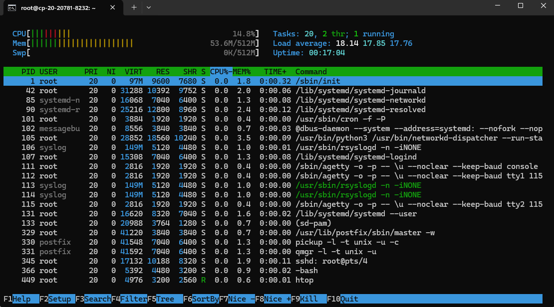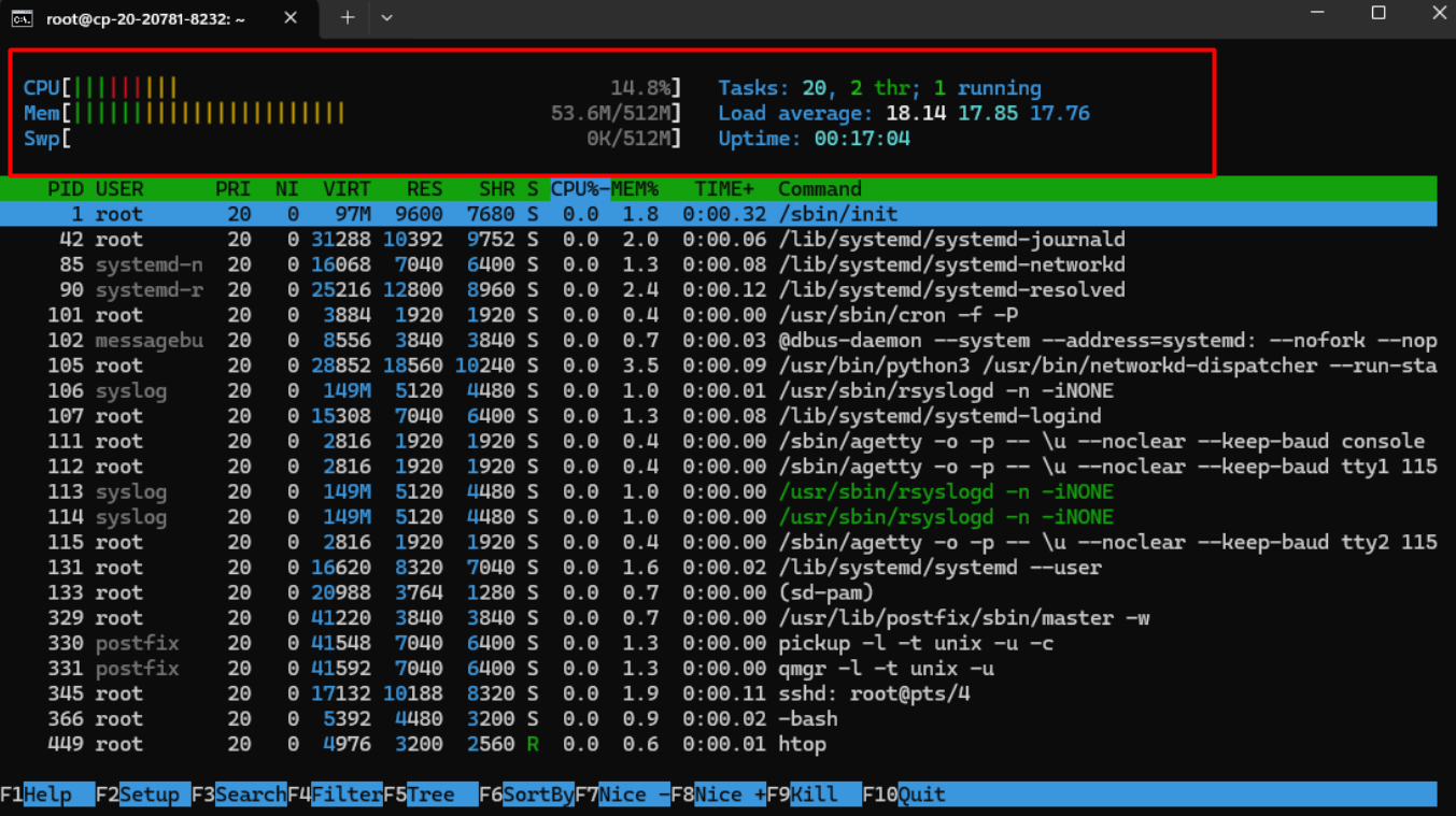 Khi htop đã được mở, bạn sẽ thấy một giao diện dạng bảng hiển thị tất cả các thông tin cần thiết về tài nguyên hệ thống.