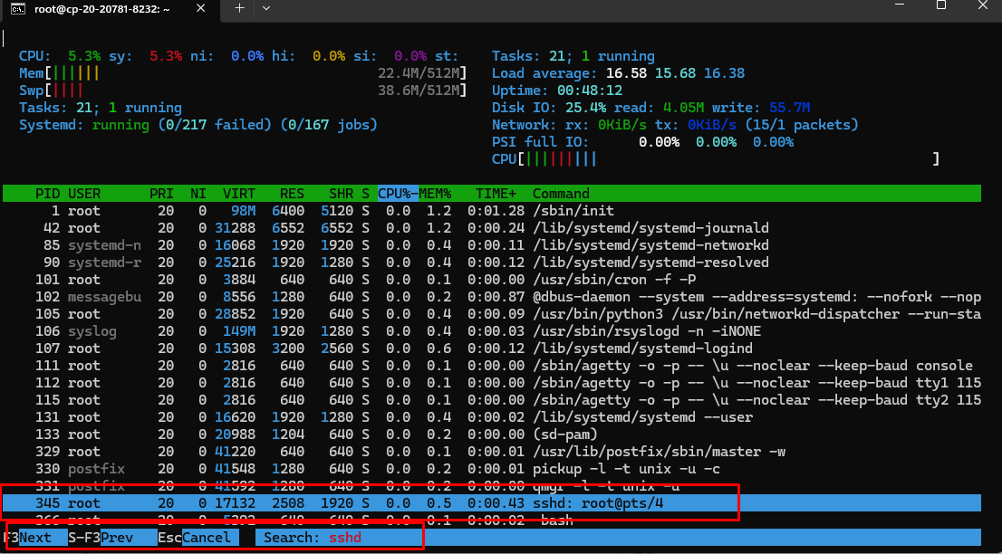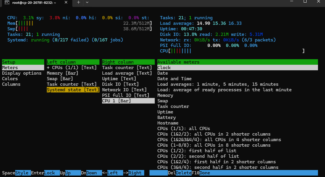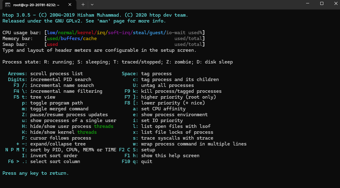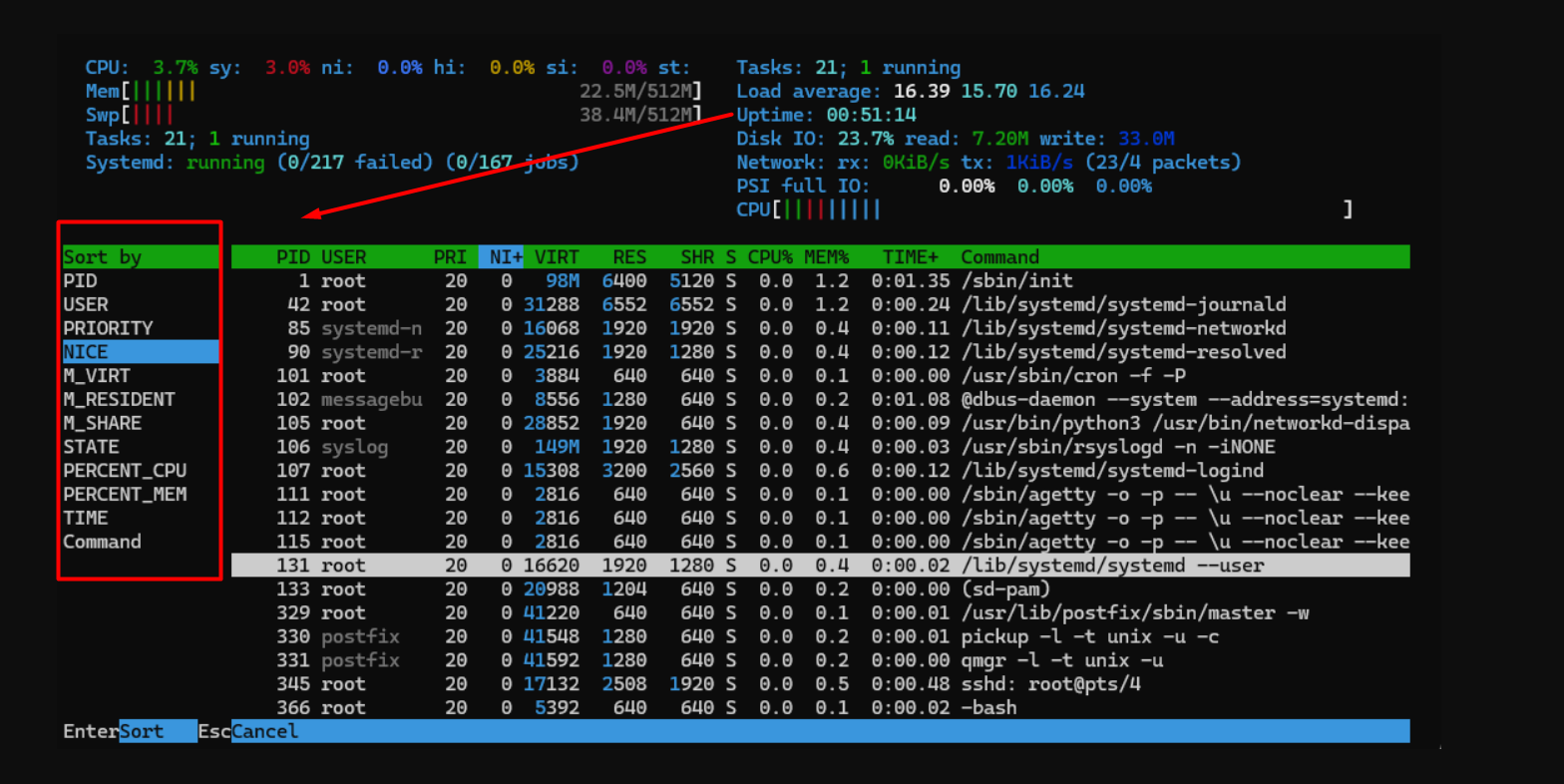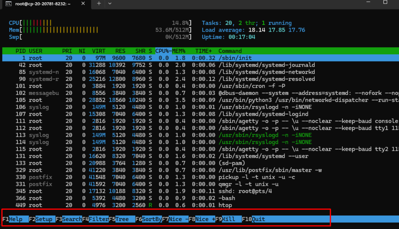 Ở phía dưới cùng là các phím tắt để hiện thị các thông tin cũng như tùy chỉnh htop