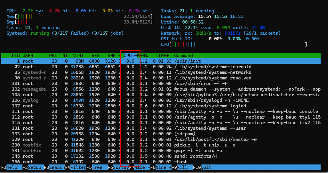 Trong htop, thông tin về CPU sử dụng được hiển thị ở đầu bảng. Bạn có thể thấy tỷ lệ sử dụng CPU của từng tiến trình cũng như tổng tỷ lệ sử dụng CPU của hệ thống. Để đọc thông tin này, bạn chỉ cần xem các cột về CPU sử dụng (%) và CPU sử dụng (lõi).Thông tin càng cao thì tải của CPU càng nặng.