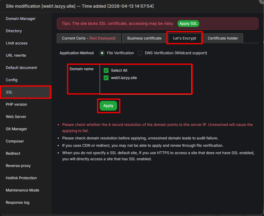 aaPanel hỗ trợ cài đặt SSL miễn phí thông qua Let’s Encrypt, cho phép: