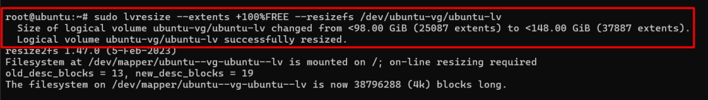 lvresize --extents +100%FREE --resizefs /dev/ubuntu-vg/ubuntu-lv