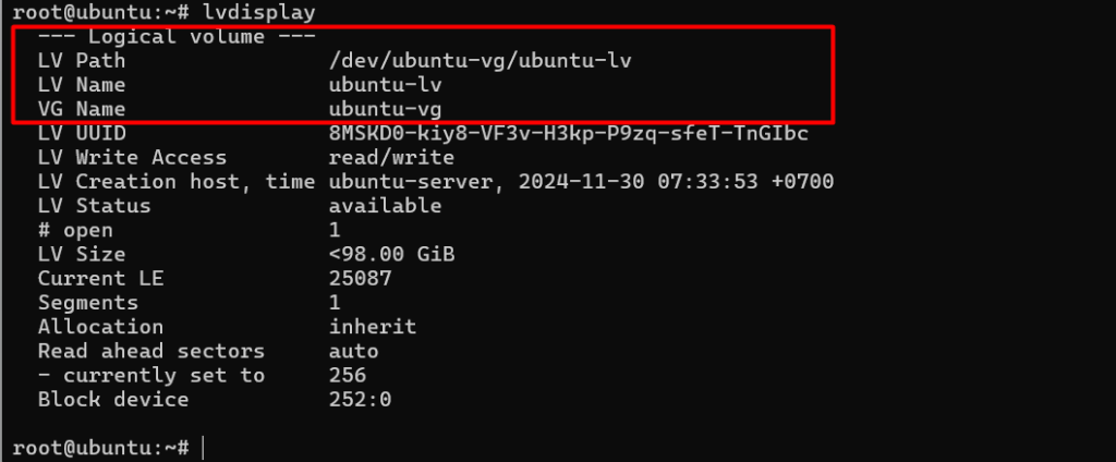 lvdisplay #Xác định tên LV