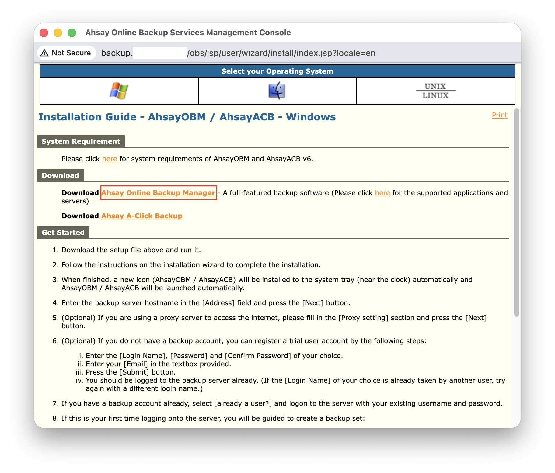 Hộp thoại tải về hiện lên, hãy chọn Ahsay Online Backup Manager để tải về