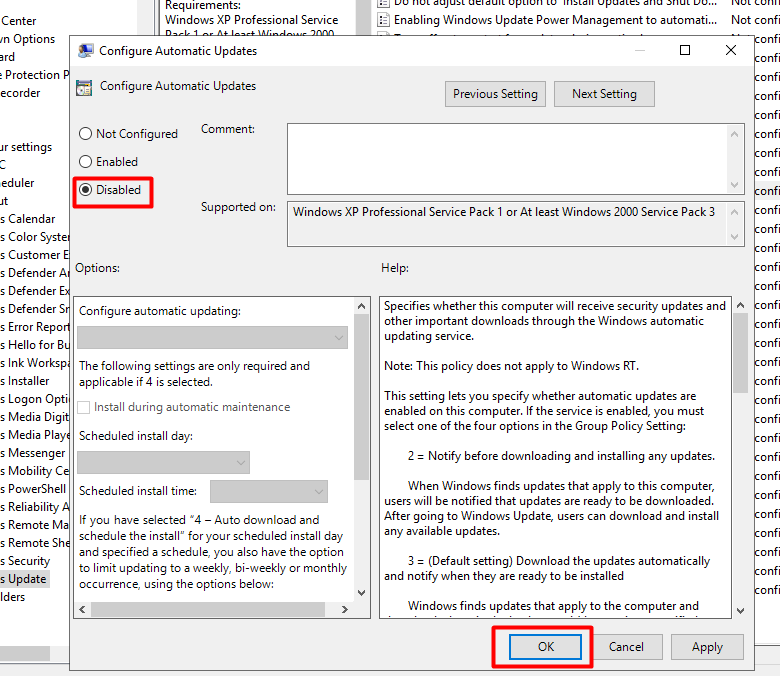 Bước 3: Tìm và mở Configure Automatic Updates → chọn Disabled → nhấn OK.
