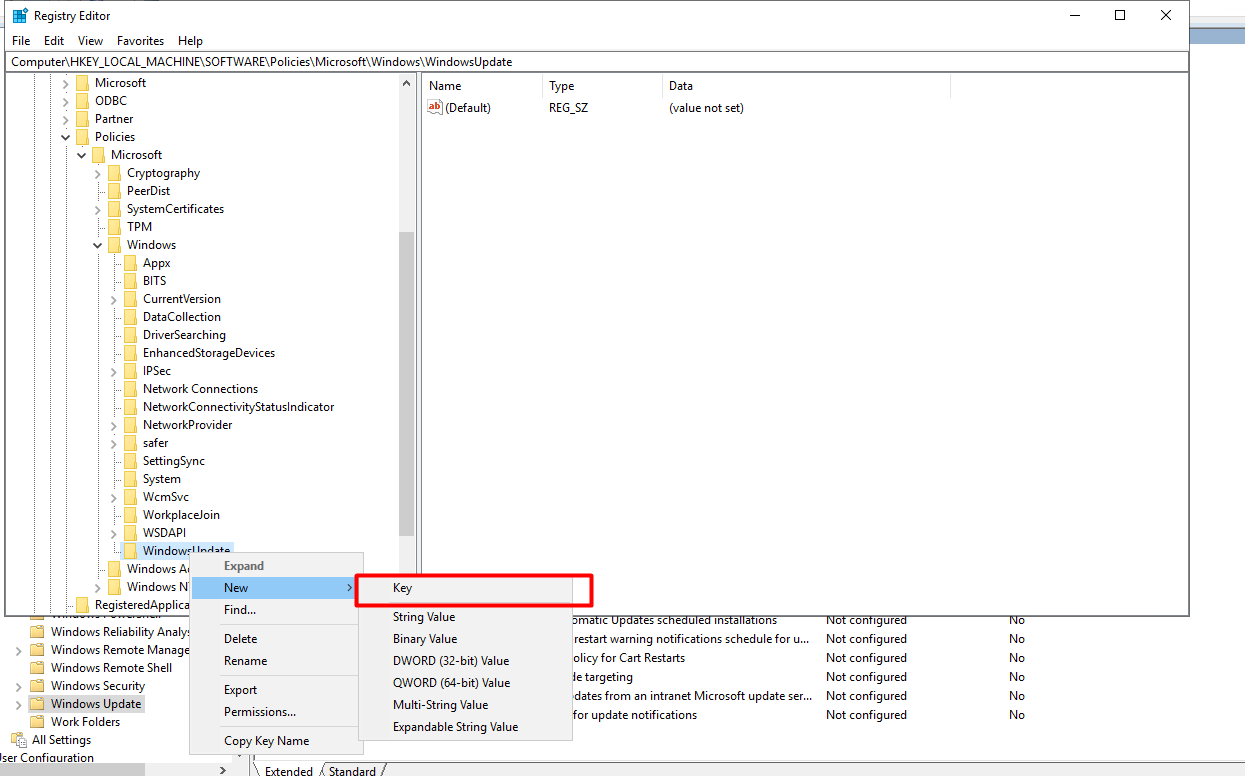 Bước 3: Nhấp chuột phải vào thư mục Windows, chọn New → Key, đặt tên là WindowsUpdate.