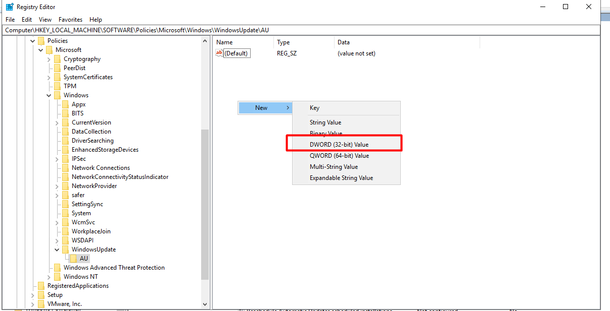 Bước 5: Trong thư mục AU, nhấp chuột phải vào khoảng trống bên phải → chọn New → DWORD (32-bit) Value → đặt tên là NoAutoUpdate.