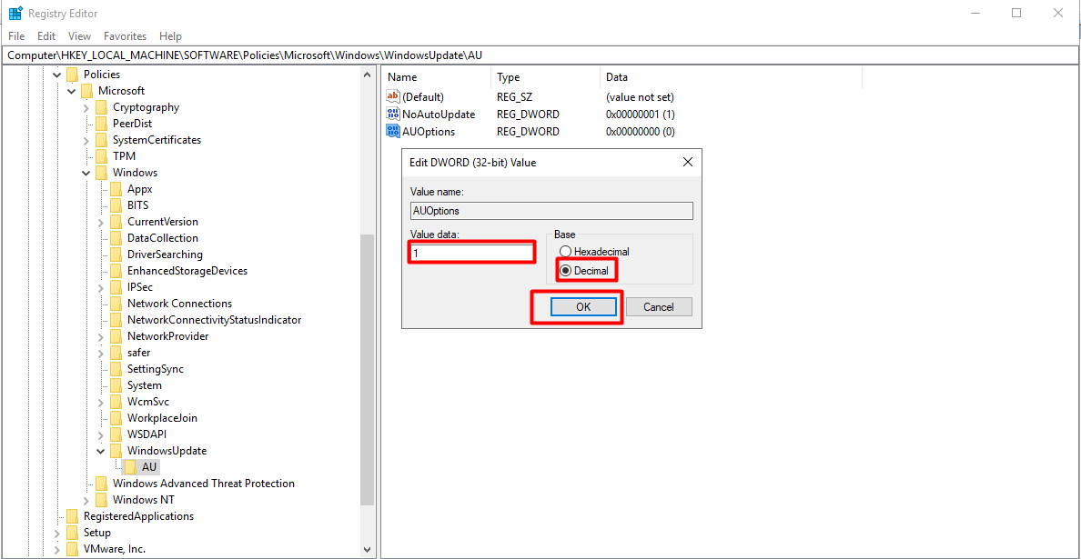 Bước 6: Nhấp đôi vào NoAutoUpdate → đặt Value = 1 → nhấn OK.