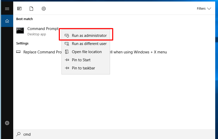 → Tìm “cmd” trong Start menu, nhấp chuột phải và chọn Run as administrator.