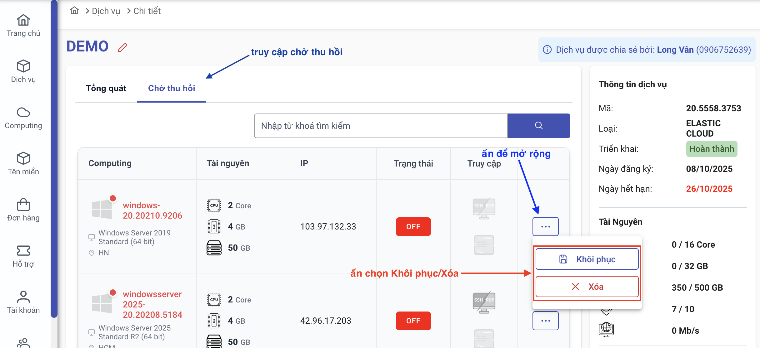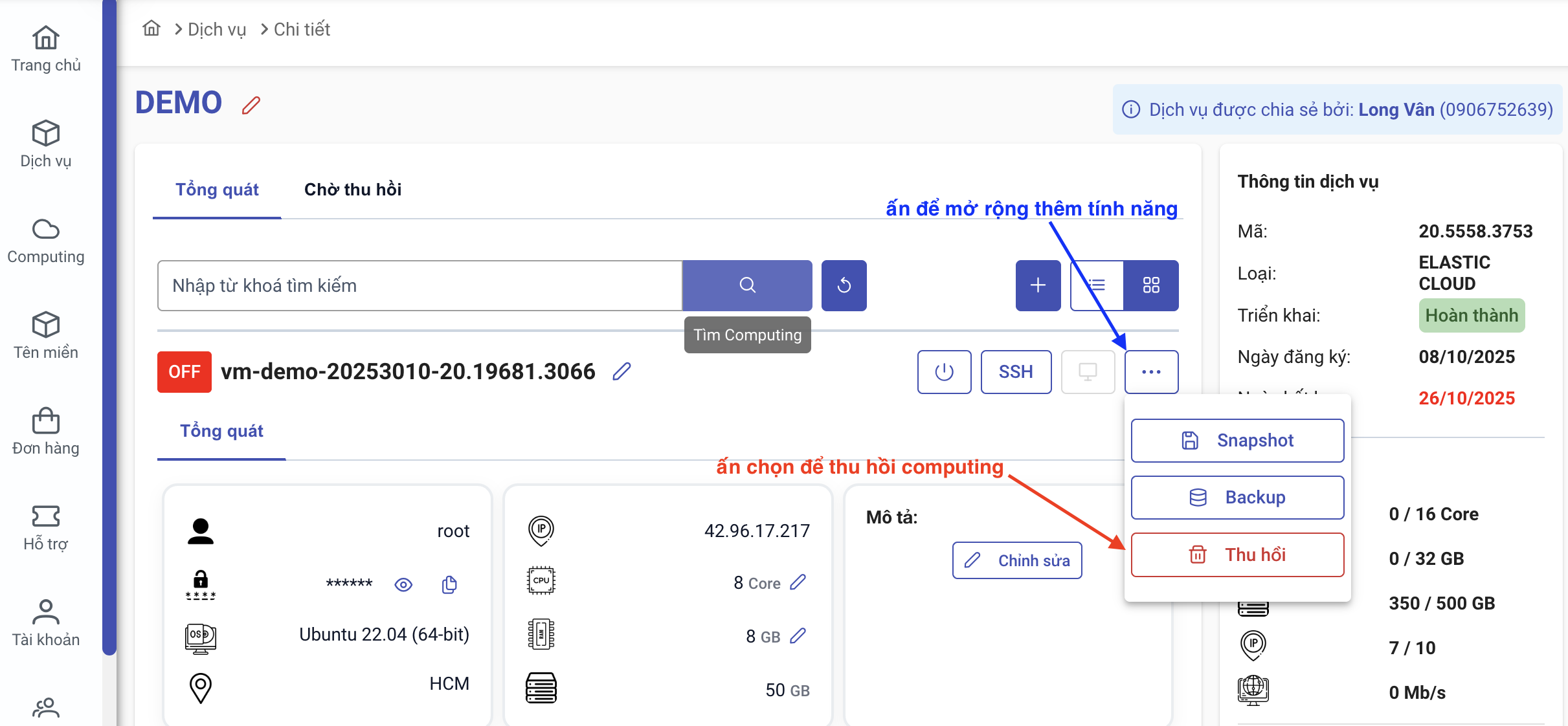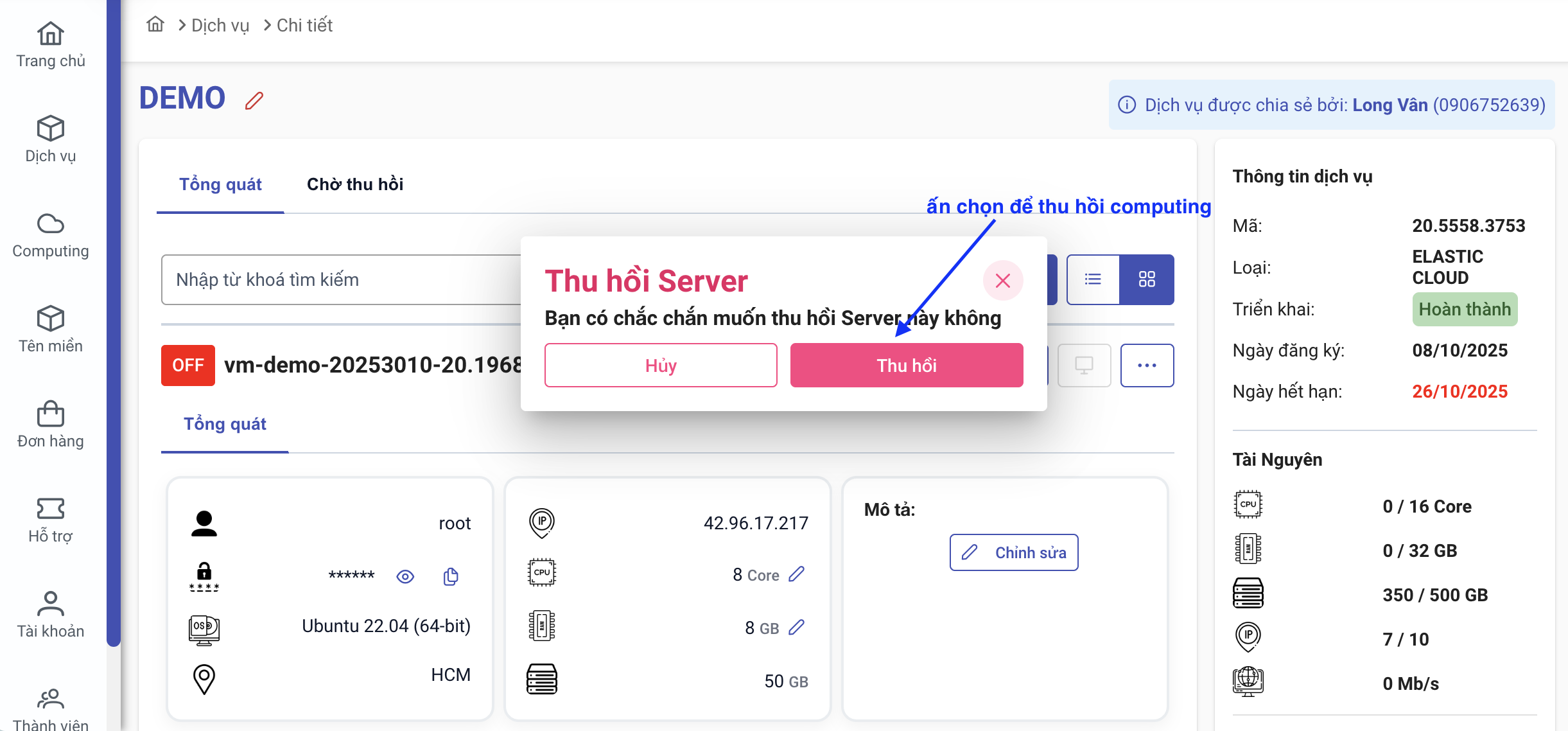 Như vậy, Long Vân đã hướng dẫn quý Khách thu hồi computing trên dịch vụ Elastic Cloud. Chúc quý Khách thành công!