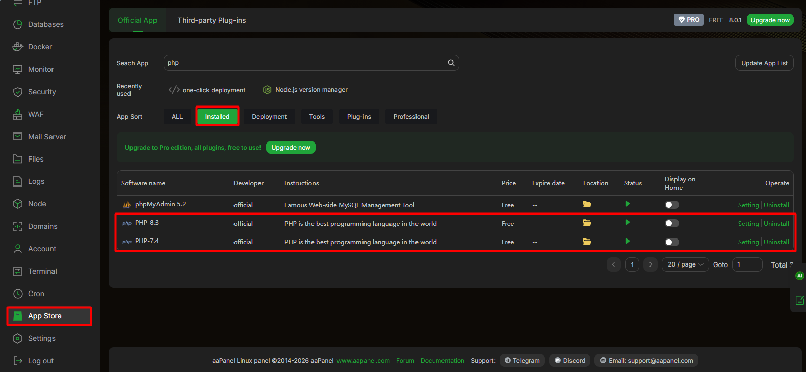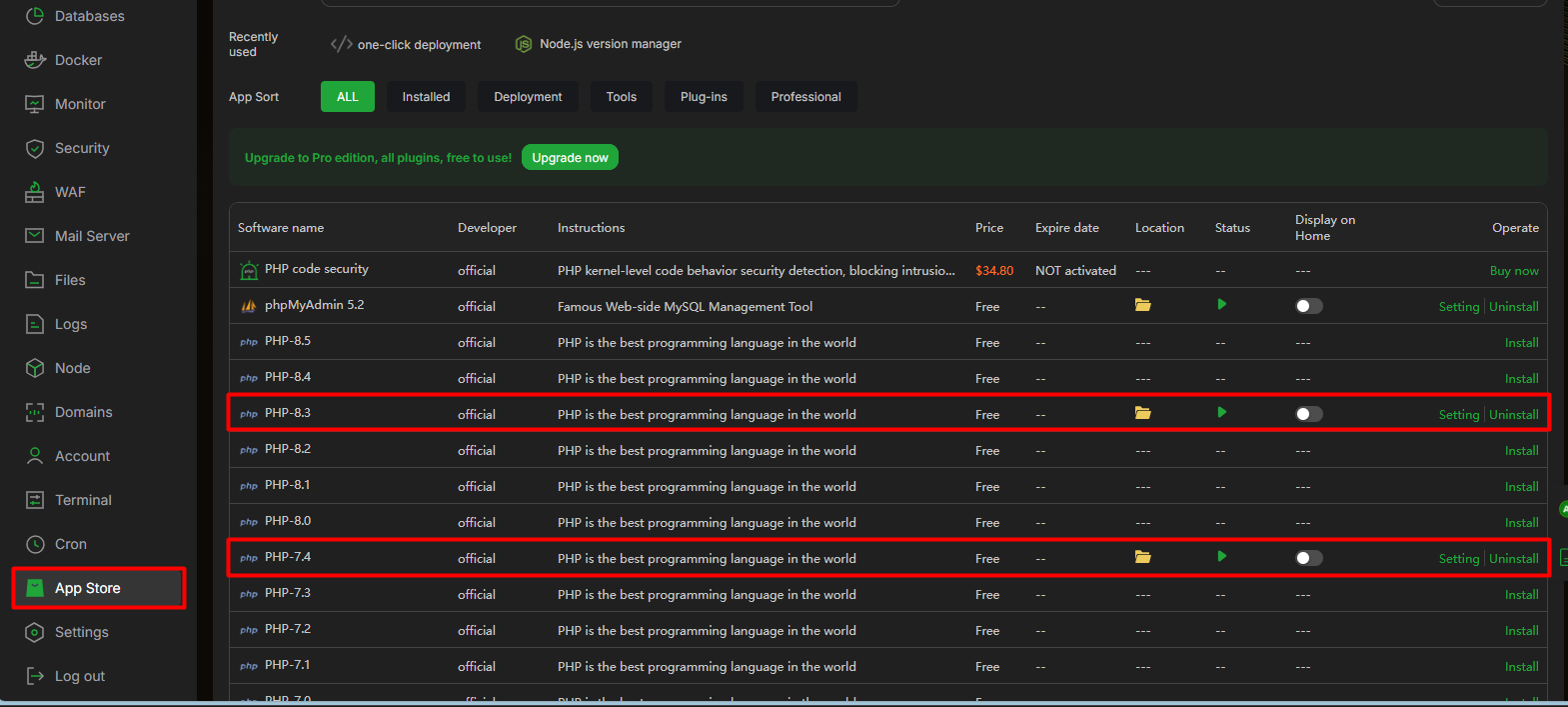 Vào mục App Store → Installed để xác nhận các phiên bản PHP đã sẵn sàng