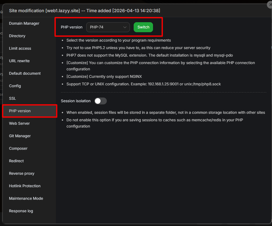 Trong quá trình vận hành nhiều website trên cùng một VPS, mỗi website có thể yêu cầu phiên bản PHP khác nhau (ví dụ: WordPress dùng PHP 8.x, trong khi project cũ cần PHP 7.2).