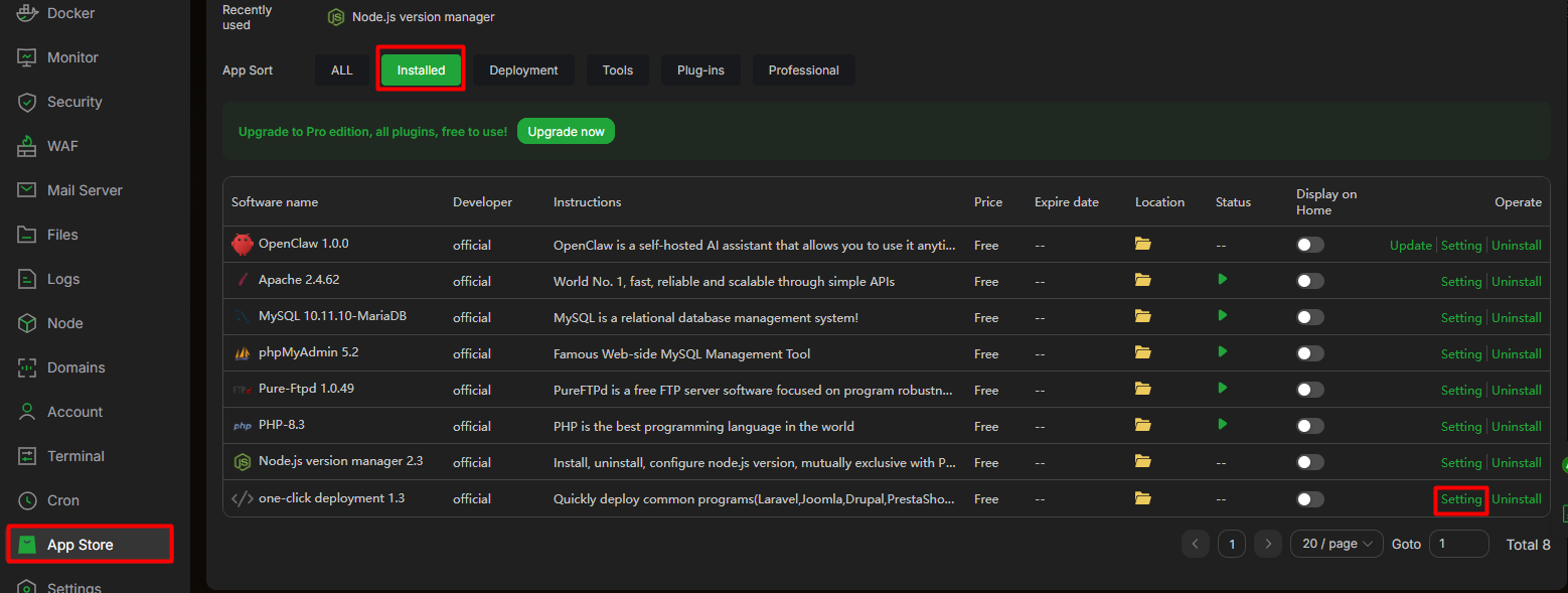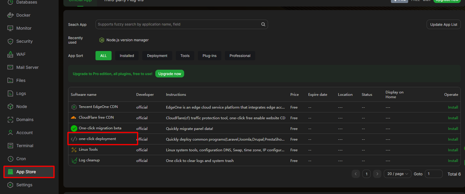 Để cài đặt ta truy cập vào Aapanel –> App Store –> plugin one-click deployment và chọn install.