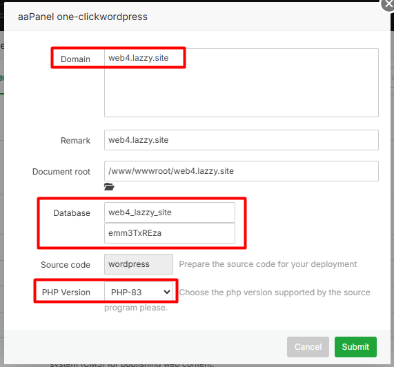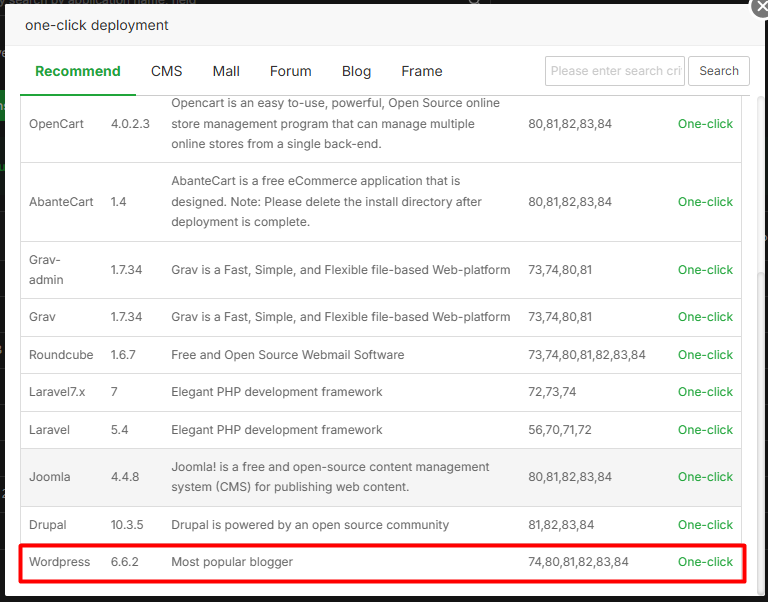 aaPanel cung cấp plugin One-click Deployment giúp cài đặt nhanh các CMS phổ biến như WordPress chỉ với vài thao tác, thay vì phải cấu hình thủ công database, source code và web server.