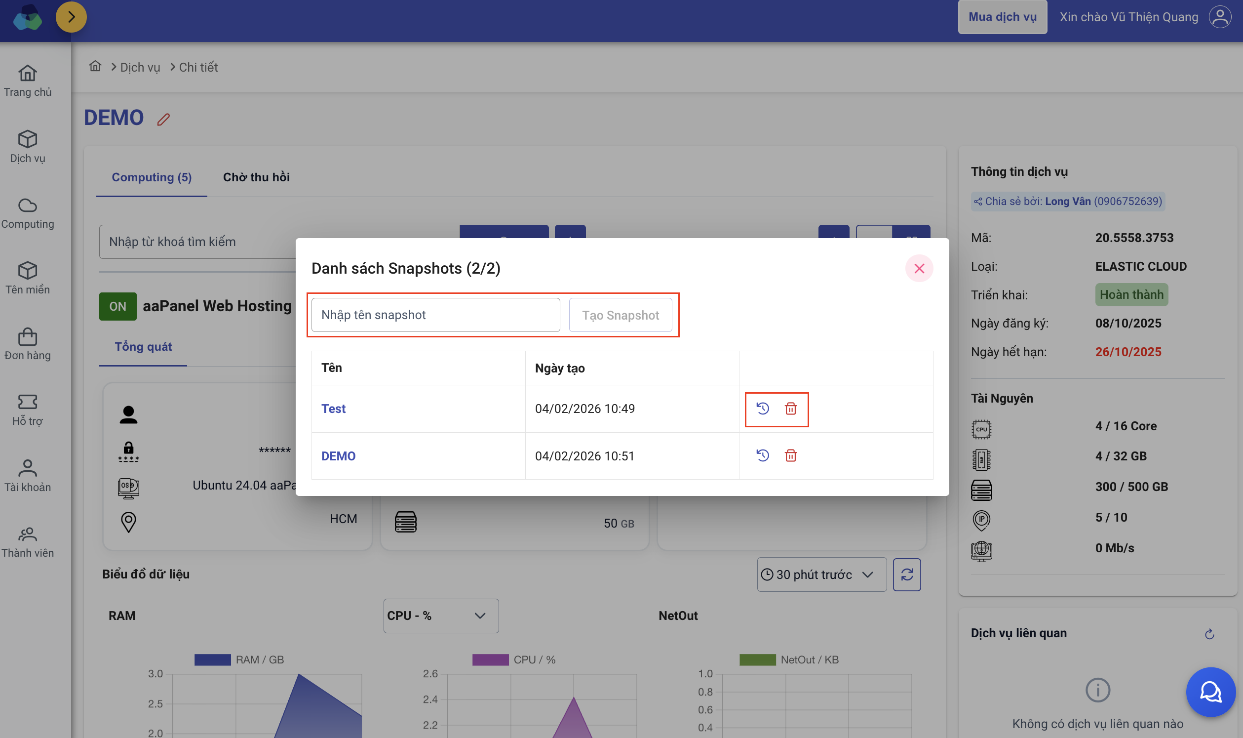 Bao gồm: Tên của snapshot, Khôi phục và Xóa snapshot