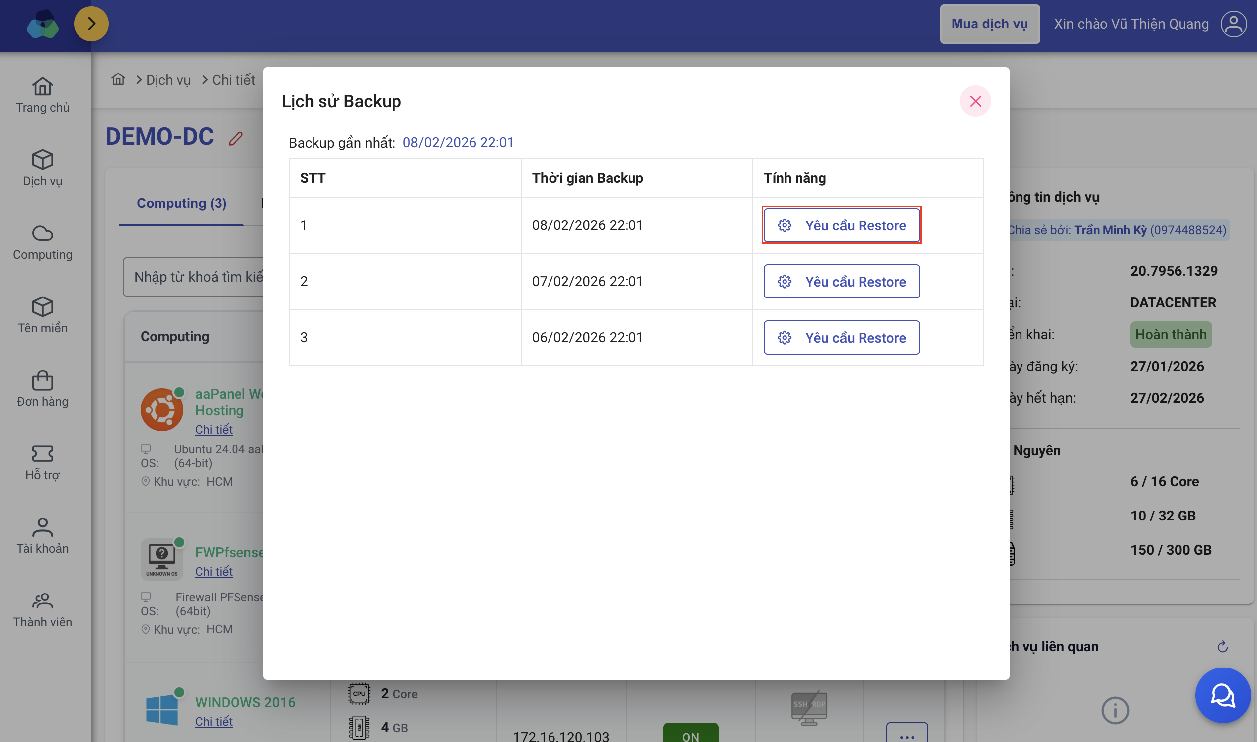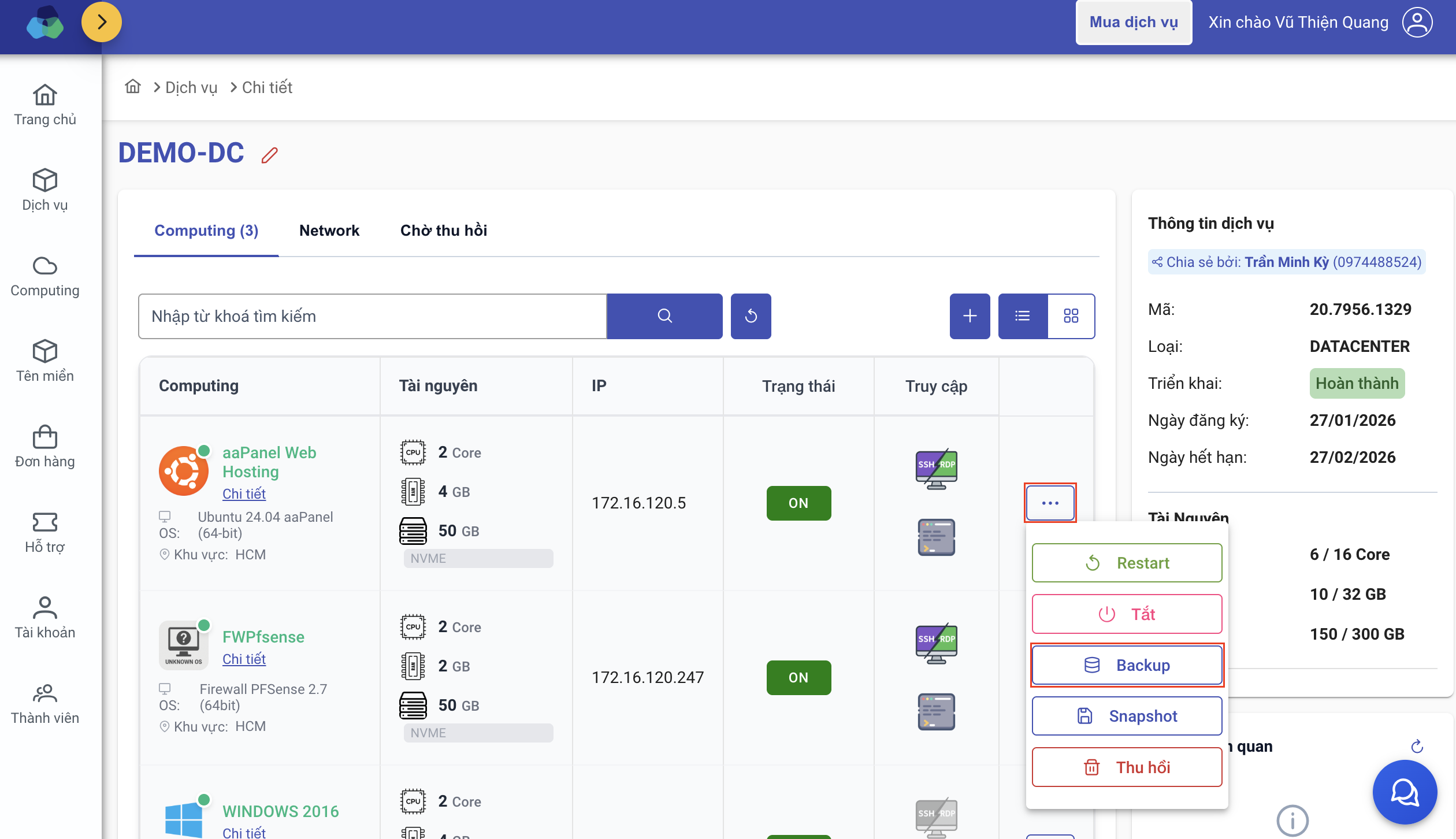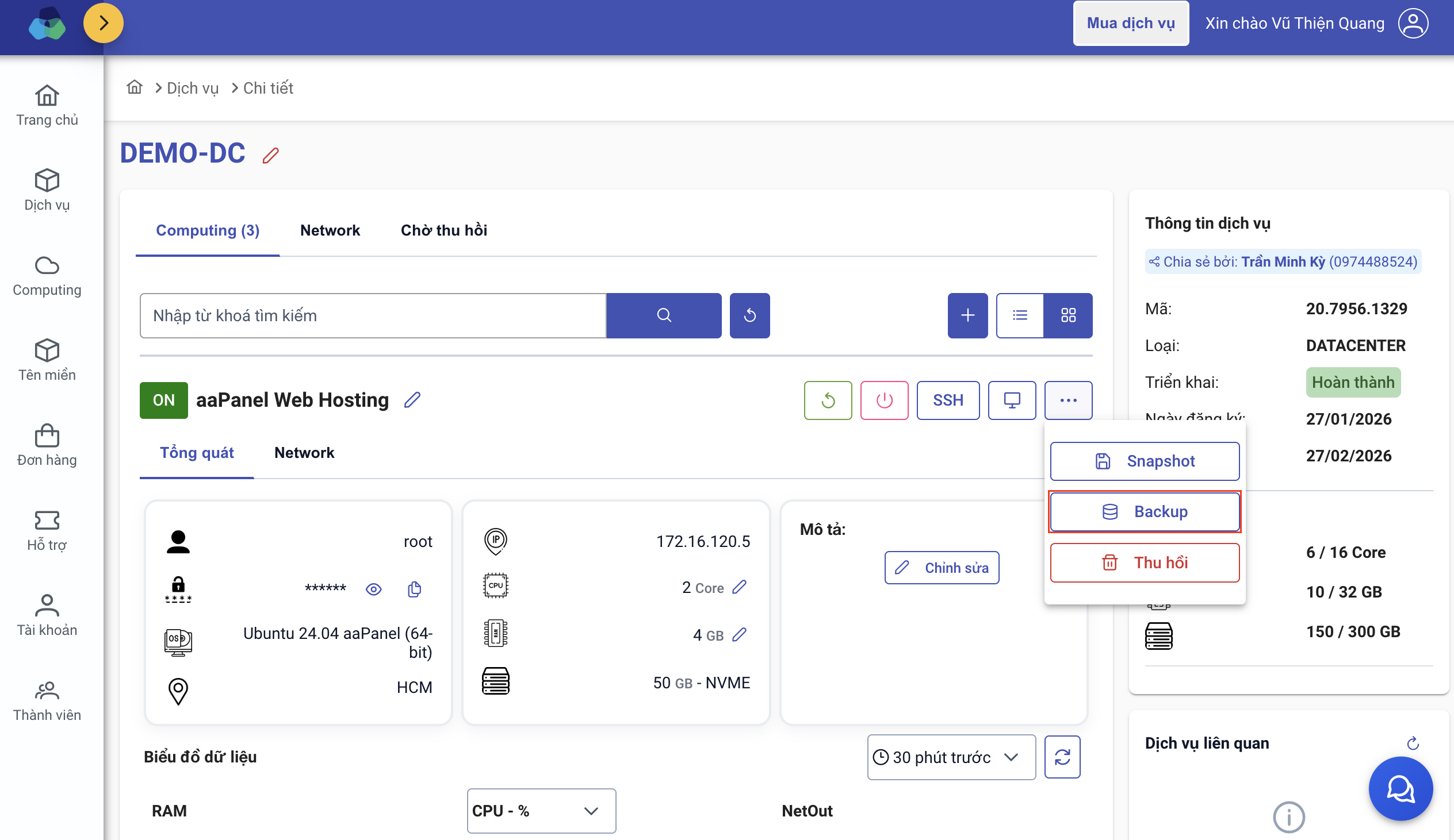 Truy cập Chi tiết dịch vụ Datacenter v2 → Tại giao diện computing