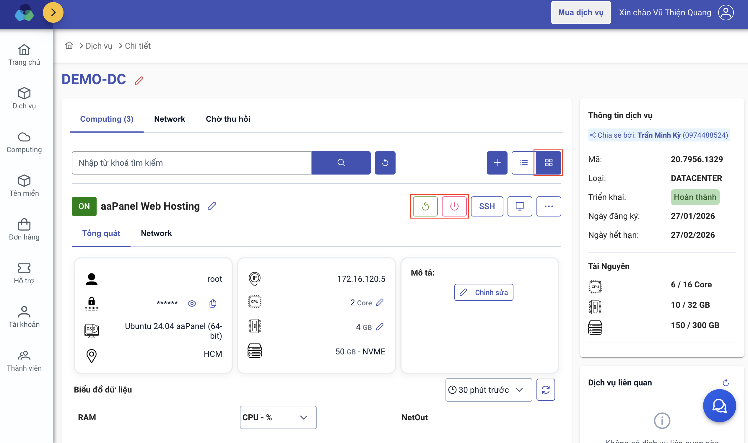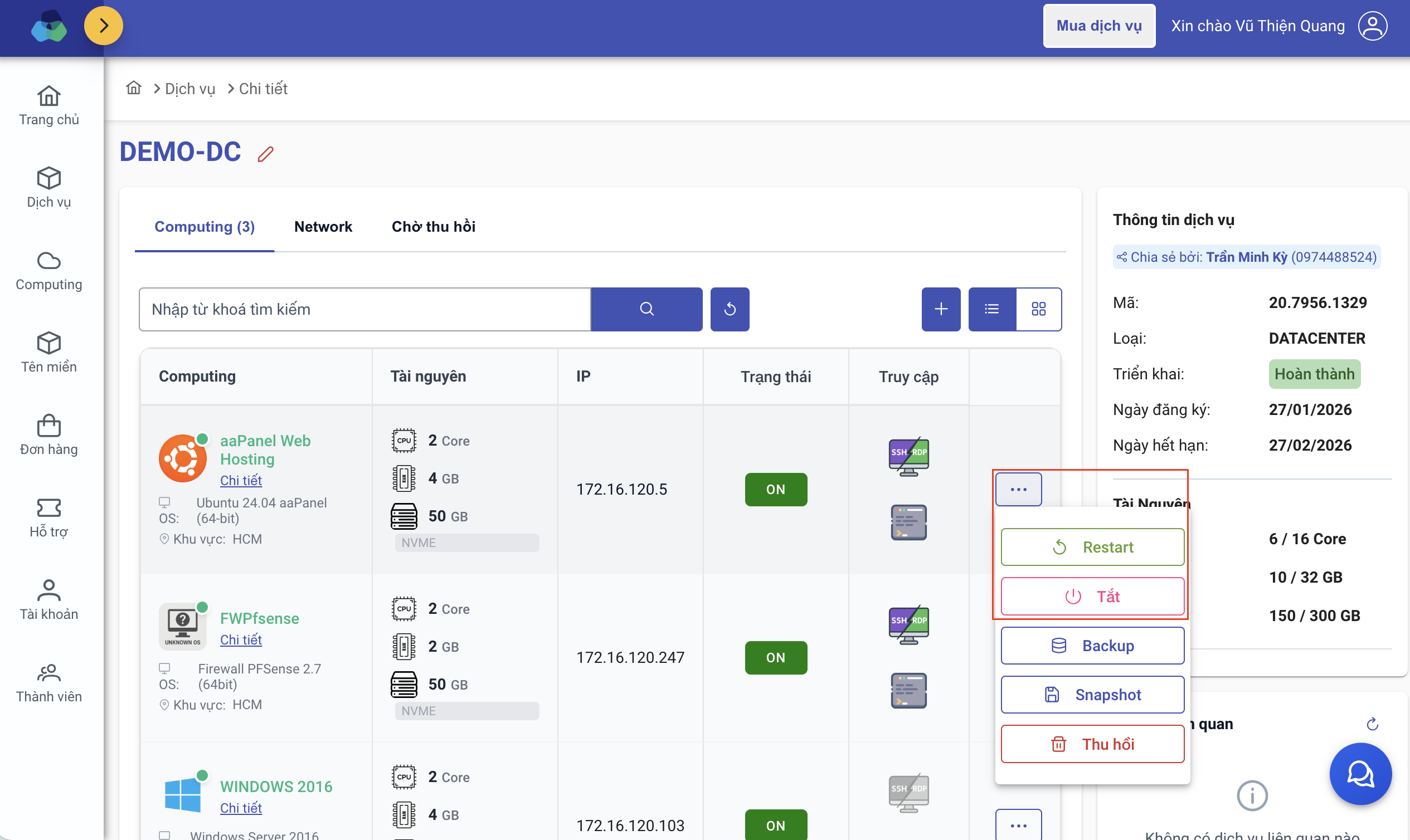 Truy cập Chi tiết dịch vụ Datacenter v2 → Tại giao diện computing → Chọn Restart/ON/OFF computing