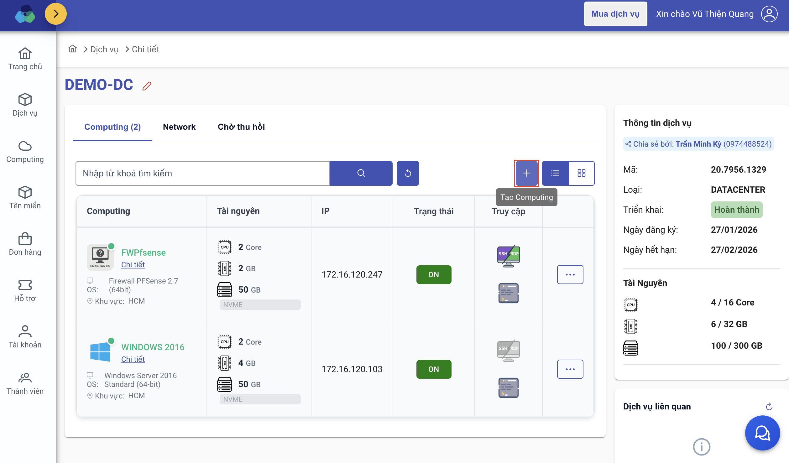 Tại giao diện chi tiết của dịch vụ Smart Datacenter v2, người dùng có thể dễ dàng tạo mới máy chủ ảo (Computing) bằng các bước sau: