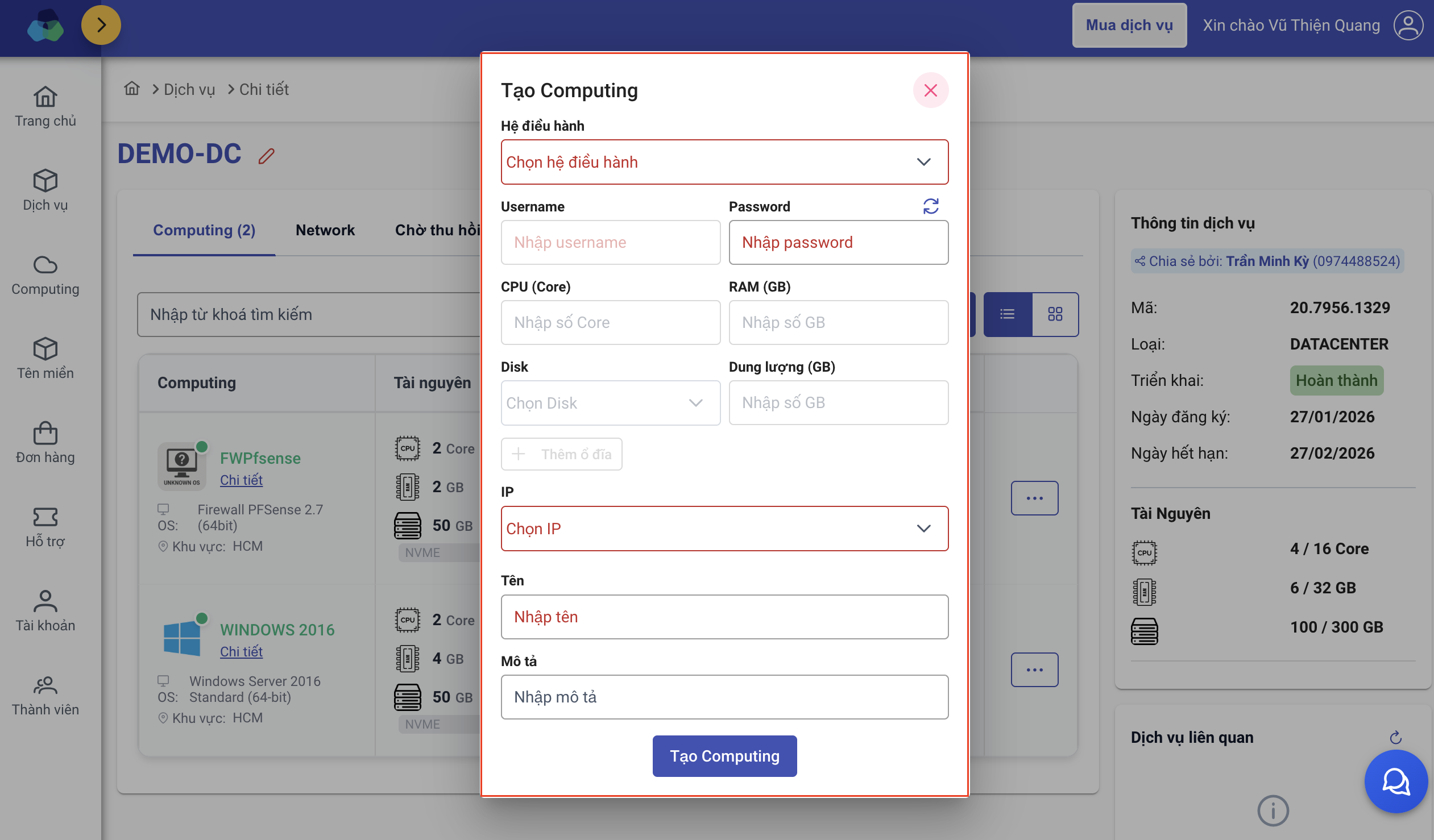 - Nhấn "Tạo Computing" để bắt đầu cấu hình máy chủ ảo.