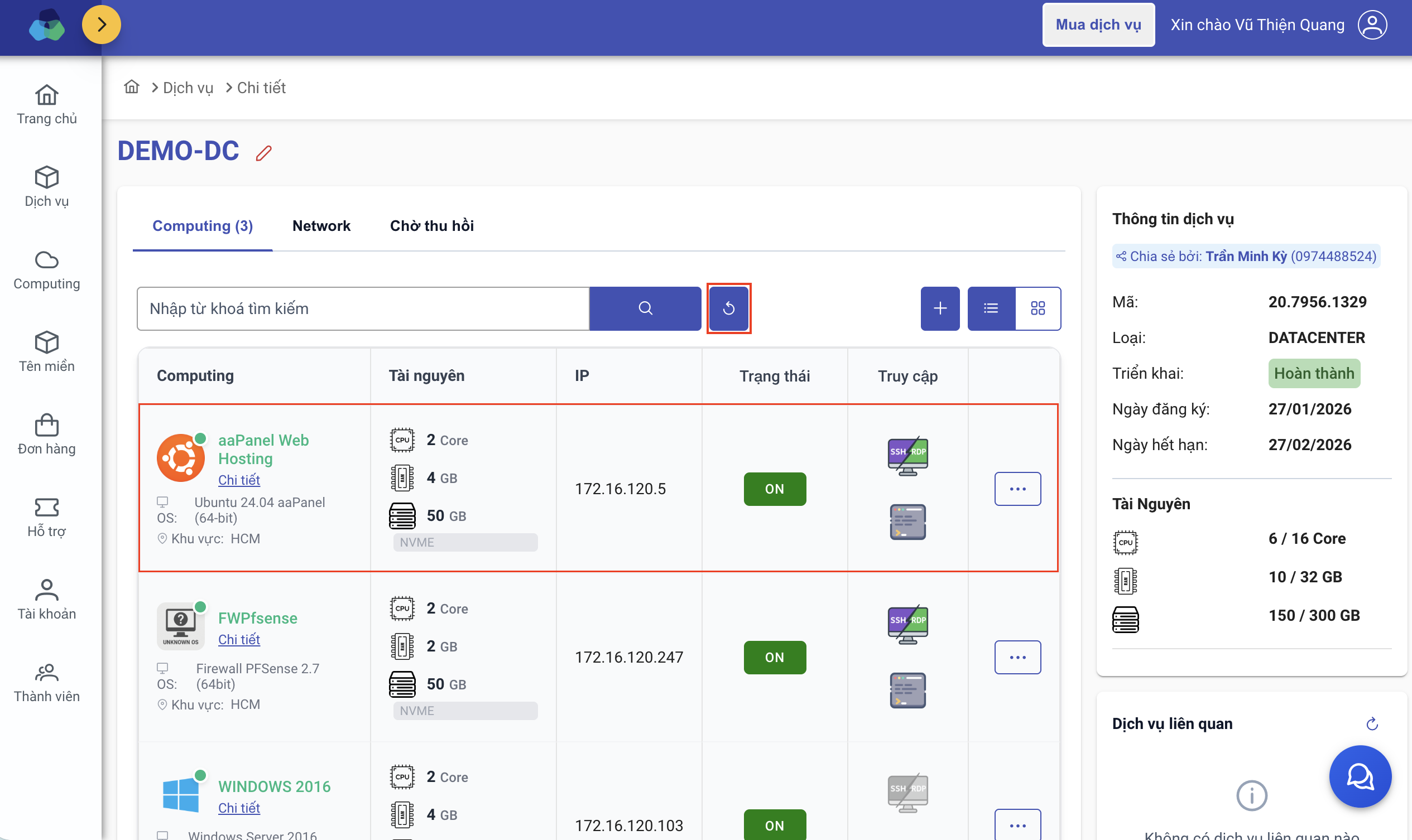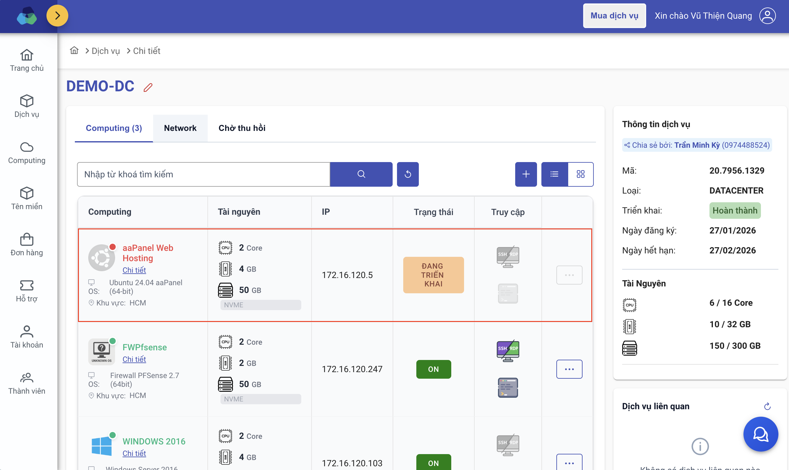 - Khi triển khai thành công, máy chủ sẽ sẵn sàng hoạt động và hiển thị trong danh sách Computing.
