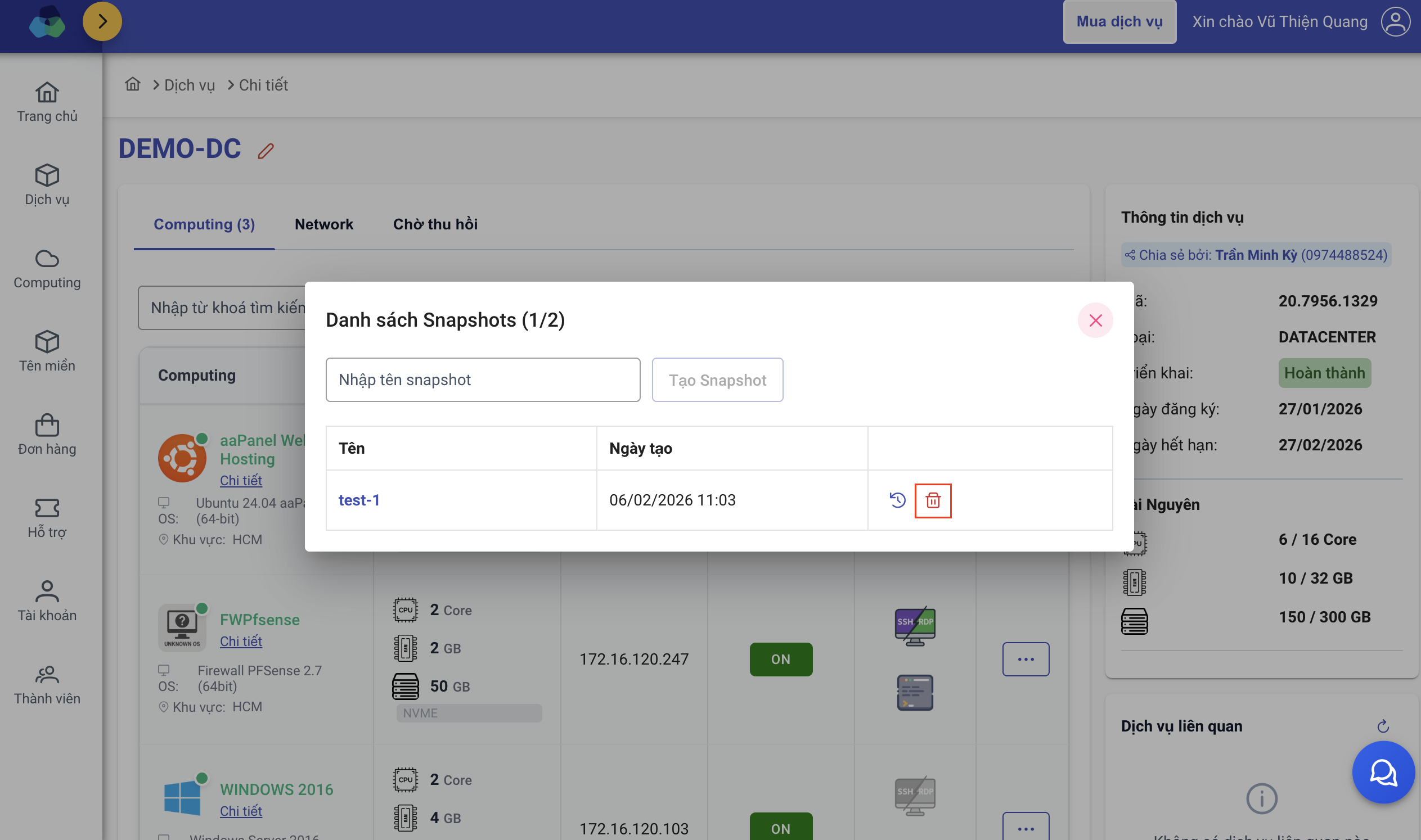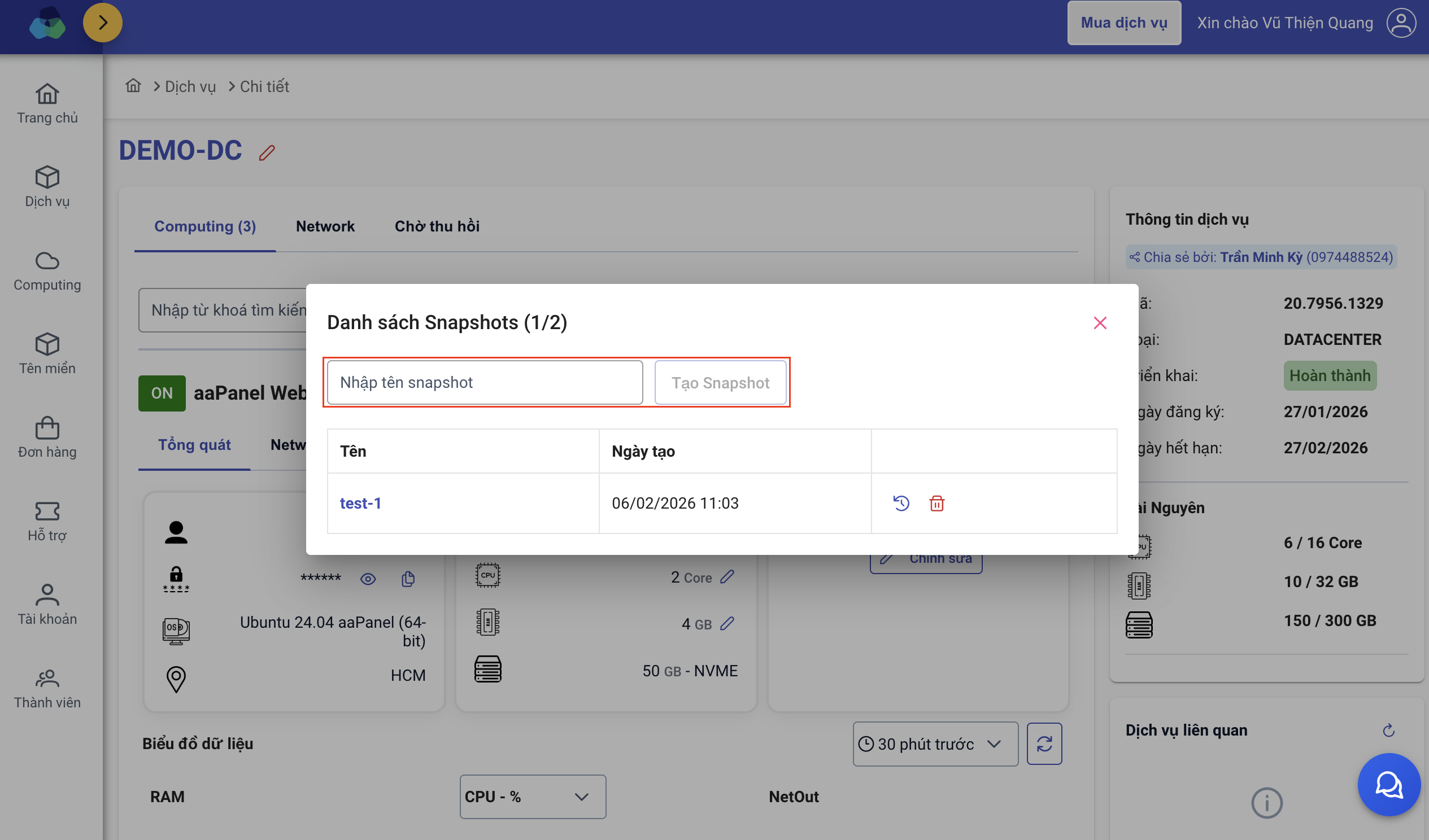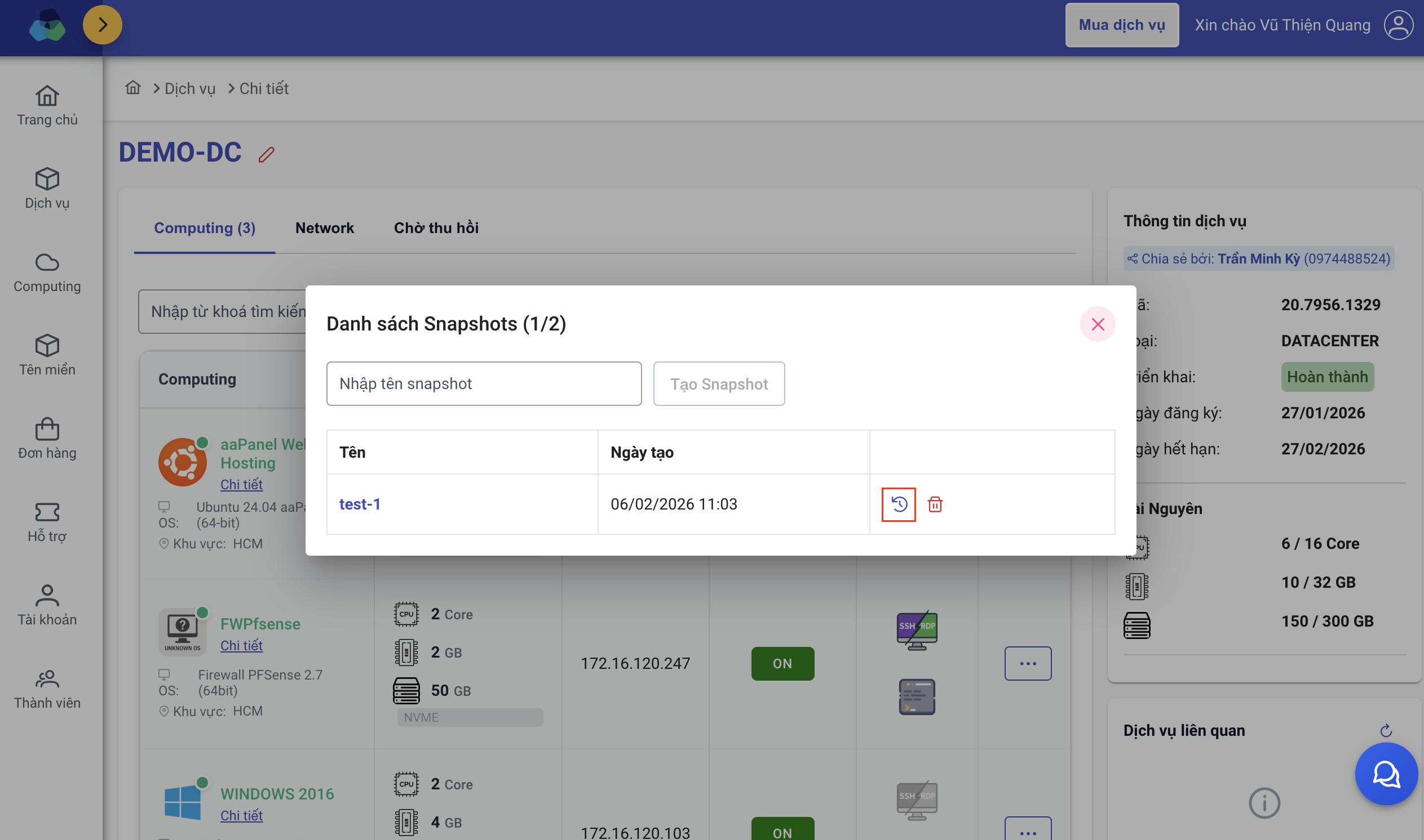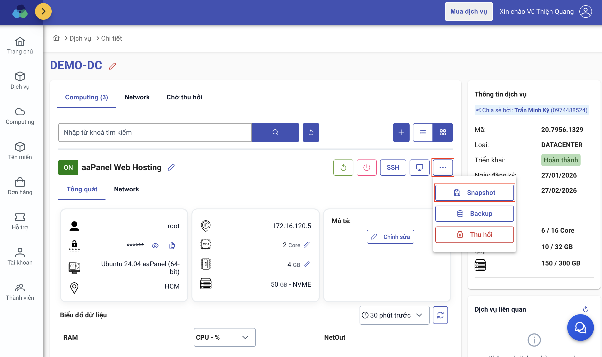 Truy cập Chi tiết dịch vụ Datacenter v2 → Tại giao diện computing